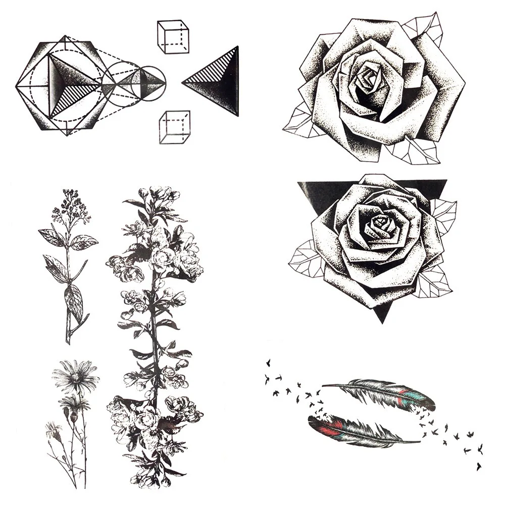 Us 0 36 Triangle Black Rose Temporary Tattoo Women Geometric Feather Tattoo Sticker Body Arm Art Fake Tatoo Leaves Girl Chest Makeup Leg In