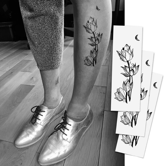 Moon Lily Flower Tattoo Temporary Tattoo Hand Drawn Design And Illustration Set Of 3