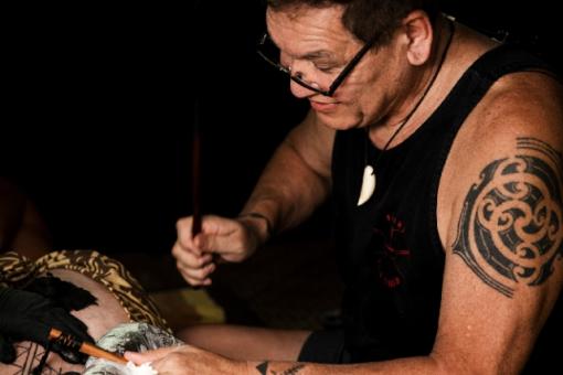 Side View Shot Of Hawaiian Tattoo Artist Making Tattoo Oahu