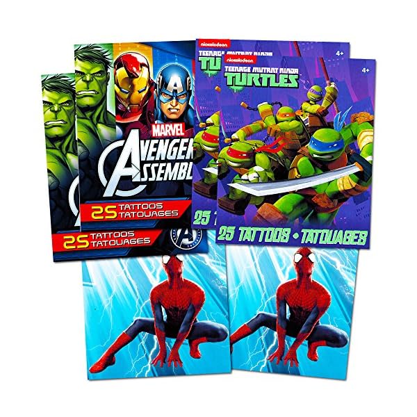 Super Hero Party Supplies Set 125 Temporary Tattoos Featuring Marvel Avengers Spiderman And Teenage Mutant Ninja Turtles